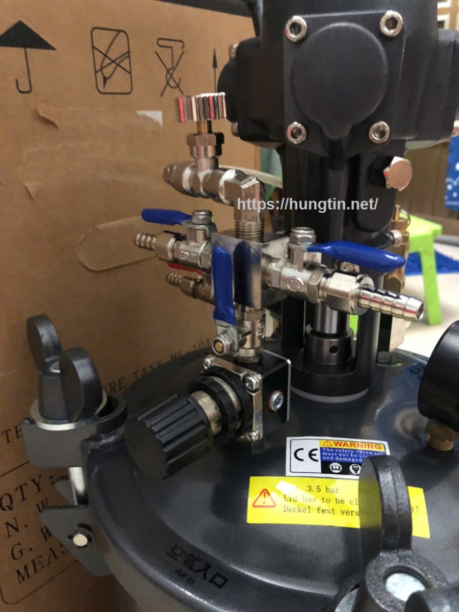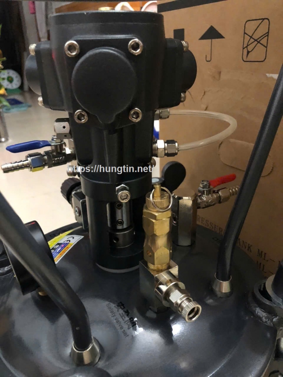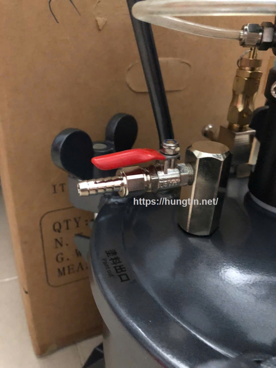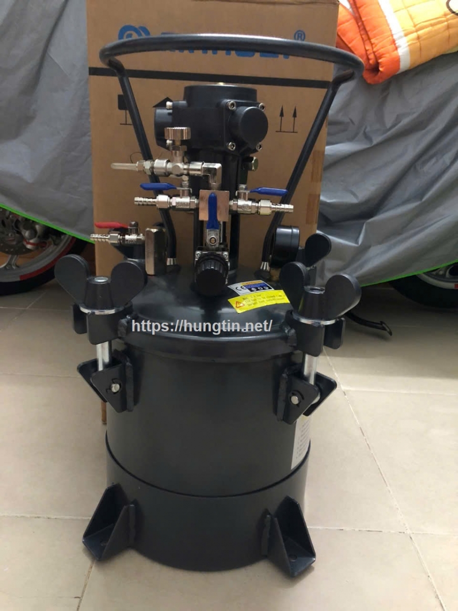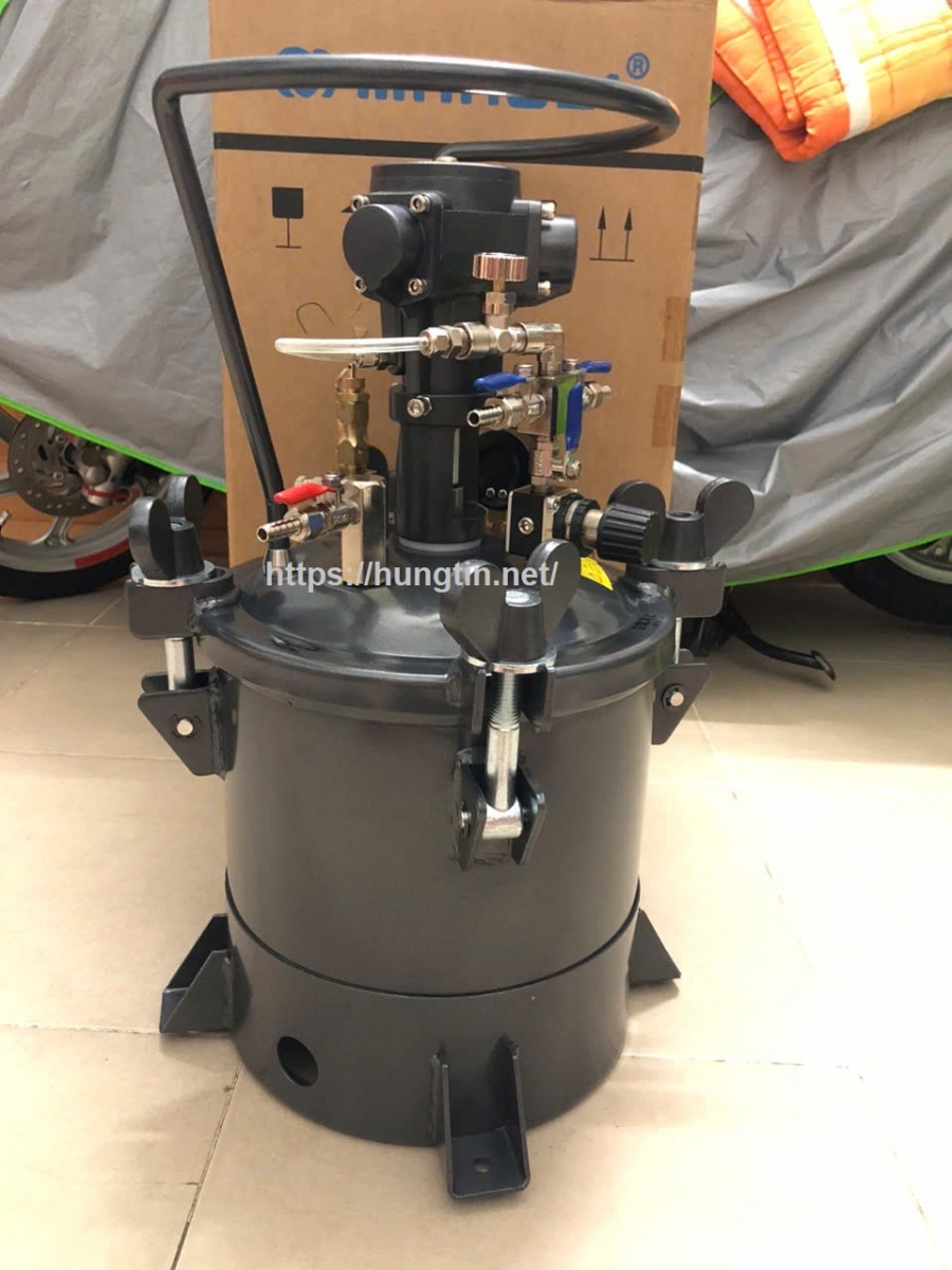– Nồi trộn sơn hoạt động bằng khí nén, Khí được nén vào bình để tống sơn ra.